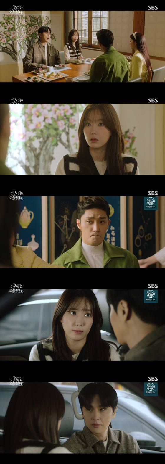 17일 방송된 SBS 월화드라마 '우리는 오늘부터'에서는 오우리(임수향 분)와 이강재(신동욱 분)가 식당에서 라파엘(성훈 분)과 아내 이마리(홍지윤 분)를 기다리는 모습이 담겼다.