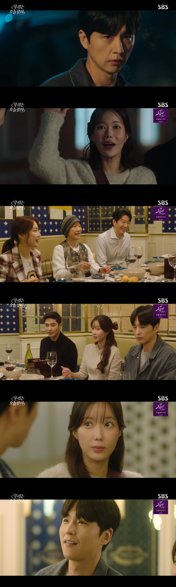 24일 방송된 SBS 월화드라마 '우리는 오늘부터'에서는 이강재(신동욱 분)가 오우리(임수향 분)와 최성일(김수로 분), 라파엘(성훈 분)이 함께 있는 자리에 합류하는 모습이 담겼다.