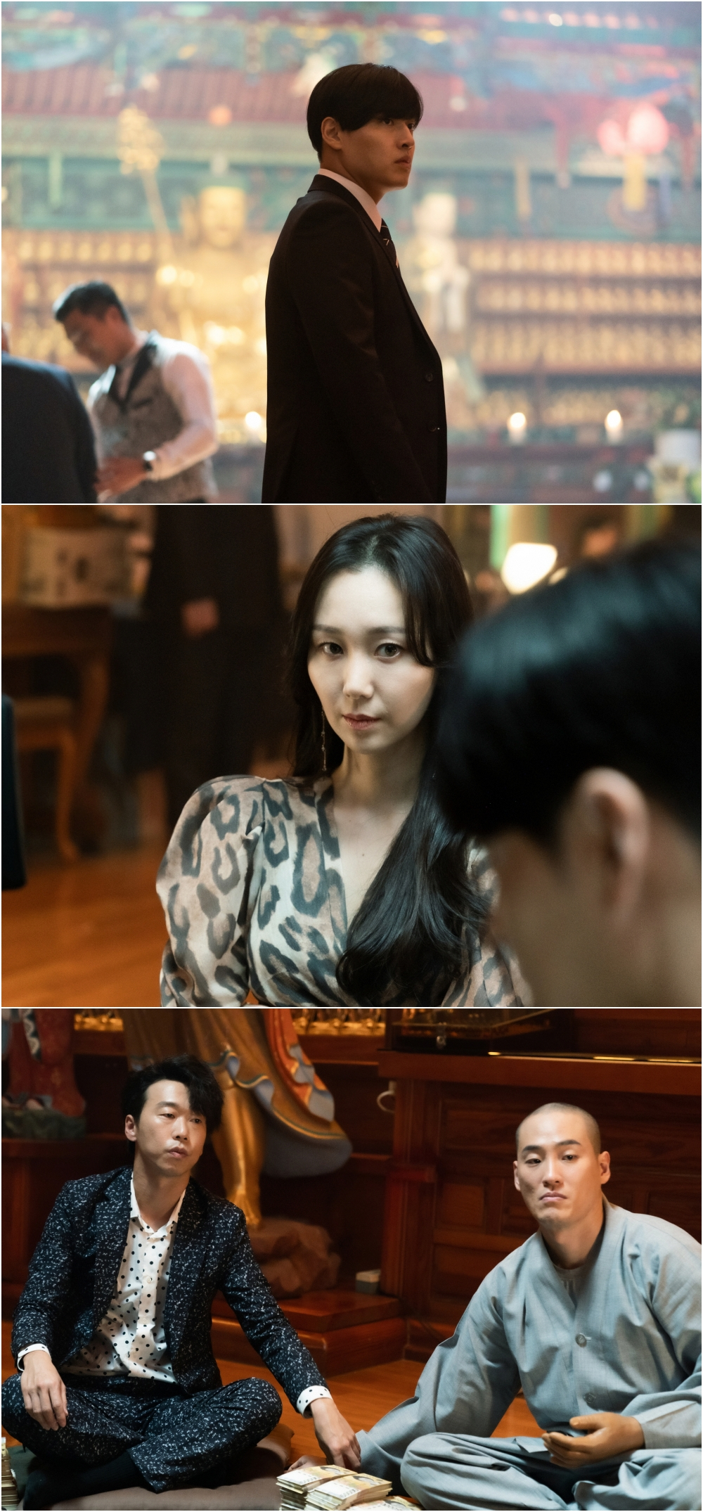 하지만 그곳에서 관찰자는 그만이 아니다. 김요한이 잠시 눈을 돌린 틈에 그를 면밀히 살피는 오수연(이유영 분)의 모습도 포착됐다. 한편, 그 사이 지폐다발 뒤편으로 의문의 물체를 주고받는 또 다른 멤버 김우상(윤병희 분)과 속세에 관심이 지대해 보이는 법복의 사내 엄익수(한규원 분). 맞부딪치는 시선 하나, 찰나의 표정 하나가 크나큰 패배를 불러올 수 있는 곳. 김요한을 노리고 벌어지는 새로운 판이 어떤 폭풍을 불러올지 궁금해진다.