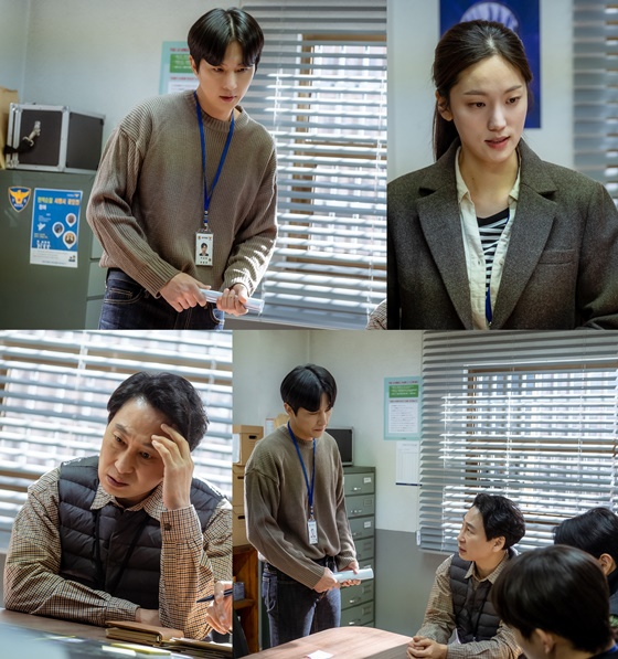 19일 공개된 스틸에는 이강재, 나희(한재이 분), 반장(김동현 분)이 경찰서 회의실에서 머리를 맞대고 김 회장의 동선을 파악하고 있다.