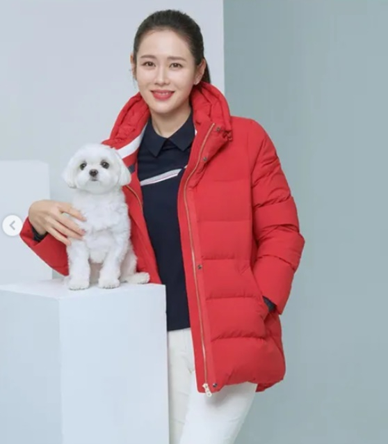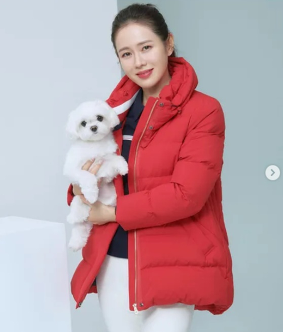 손예진은 키티를 안고 환하게 미소 짓고 있다. 빨간색 패딩을 입고 머리를 묶은 손예진은 임신 후 볼살이 통통하게 올라 더 어려진 모습. 여진히 아름다운 미모가 시선을 사로잡는다. 키티는 엄마 손예진을 닮은 듯 예쁜 얼굴과 새초롬한 표정, 셀럽견 다운 포즈로 귀여움을 자아낸다.