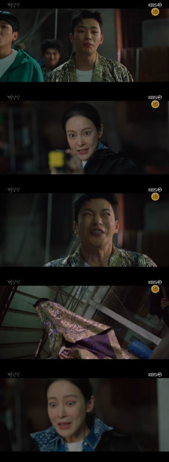 25일 오후 방송된 KBS 2TV 월화드라마 '미남당'에서는 남한준(서인국 분)이 한재희(오연서 분)의 테이져건에 맞고쓰러진 모습이 담겼다.