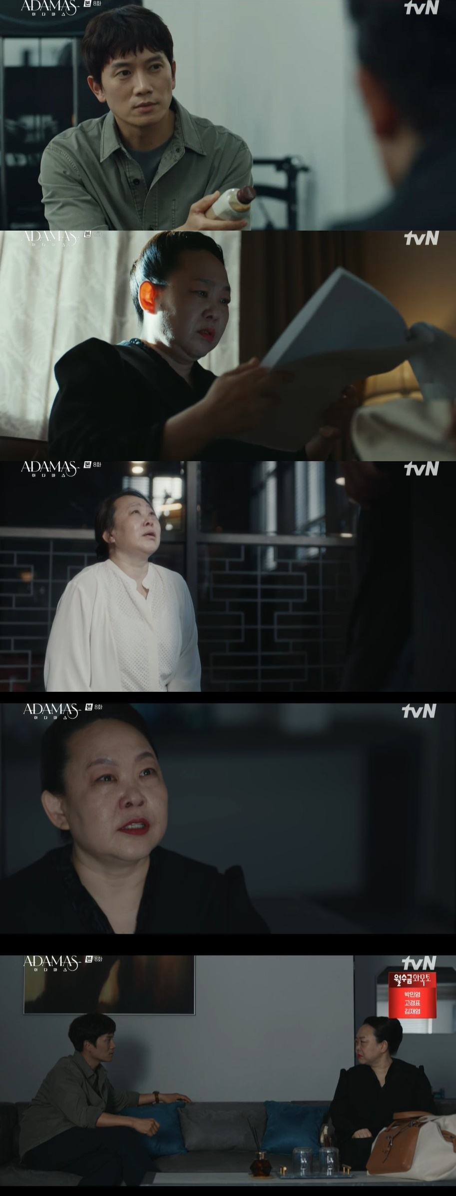18일 오후 방송된 tvN 수목드라마 '아다마스'에서 하우신(지성 분)이 오여사(우현주 분)를 통해 권집사(황정민 분)에게 의도적으로 소설이 전달되게 하는 모습이 담겼다.