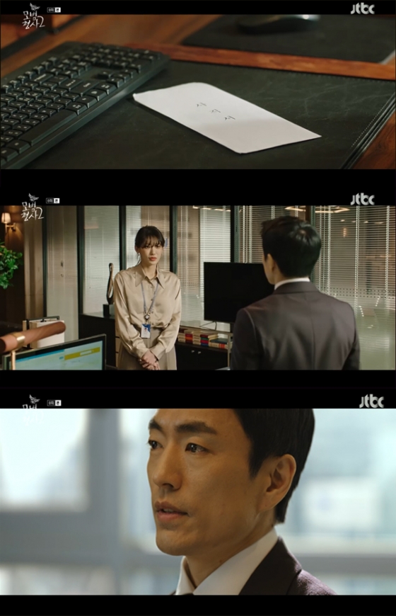 21일 방송된 JTBC 토일드라마 '모범형사2'(극본 최진원, 연출 조남국) 8회에서는 홍서영(문보경 분)은 아빠의 말에 따라 TJ그룹 법무팀 팀장 우태호(정문성)를 찾아 사직서를 제출하는 장면이 그려졌다.