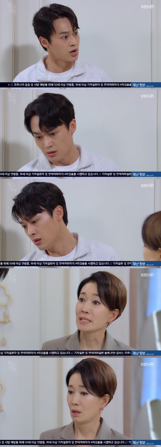 19일 오후 방송된 KBS 2TV 일일드라마 '황금 가면'에서는 SA 그룹 차화영(나영희 분) 회장이 문을 걸어 잠근 아들 홍진우(이중문 분)를 부르는 장면이 담겼다.