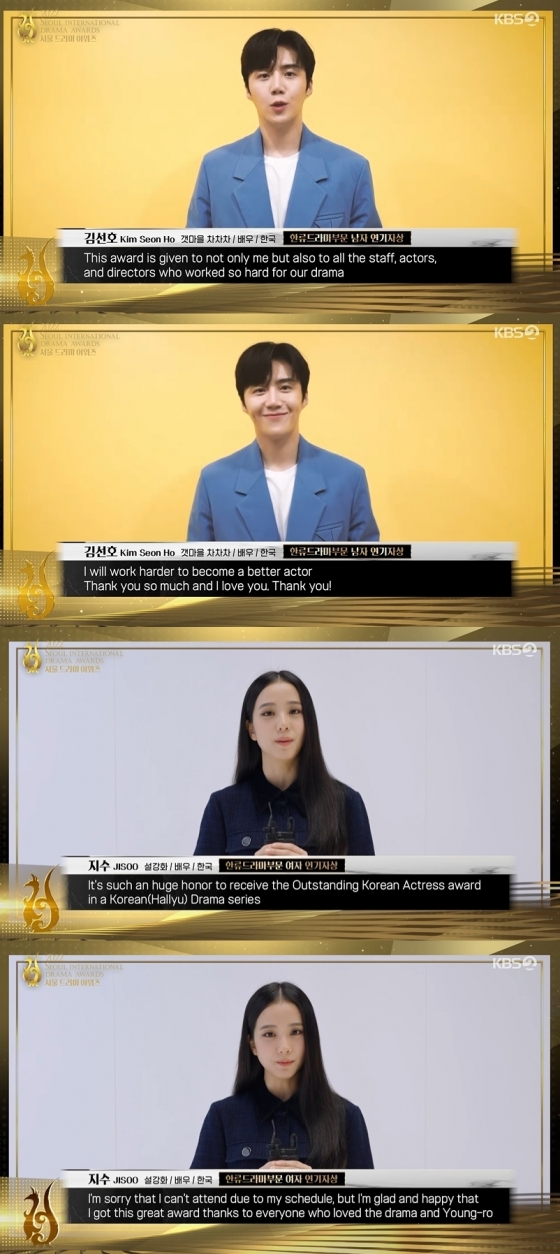 배우 김선호와 걸 그룹 블랙핑크 멤버 겸 배우 지수가 '2022 서울 드라마 어워즈'에서 한류 드라마 부문 남녀 연기자상을 각각 수상했다.
