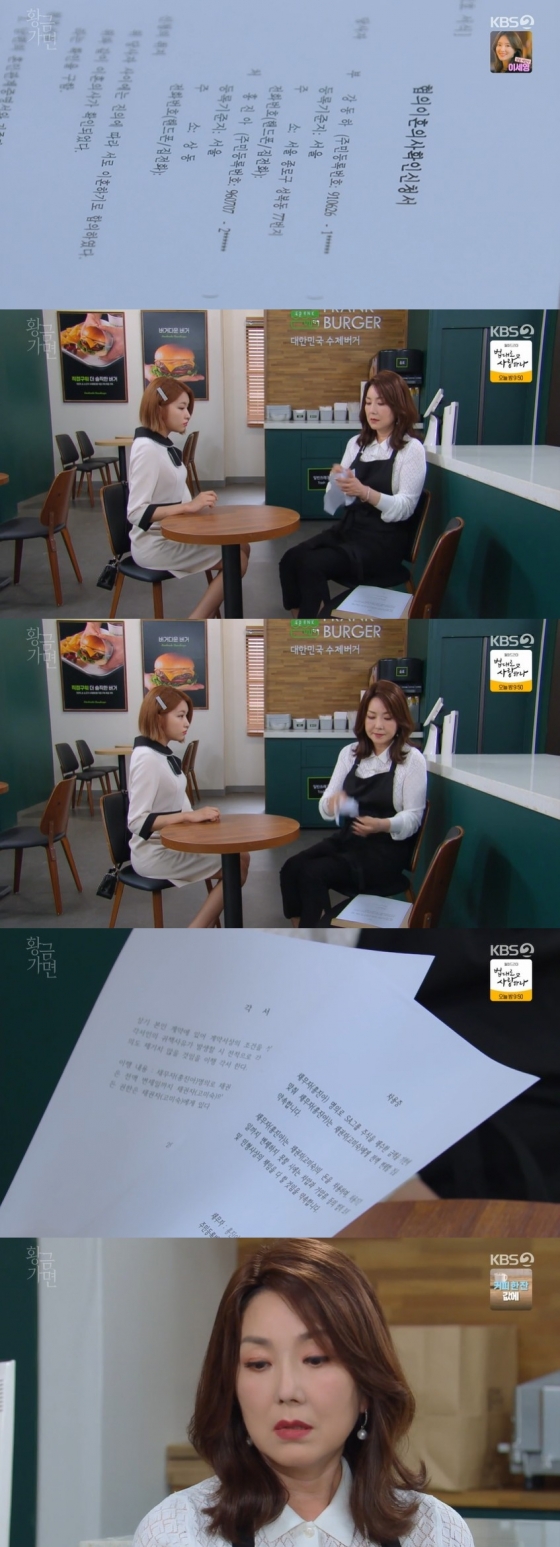 '황금가면'에서 이휘향이 공다임에게 아들 이현진과의 이혼서류를 내밀었다.