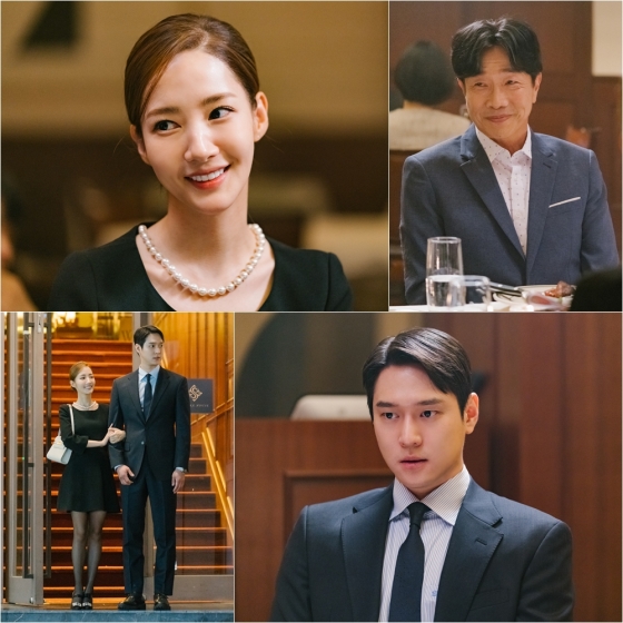 tvN 수목드라마 '월수금화목토'(연출 남성우/극본 하구담/제작 스튜디오육공오) 측이 29일 최상은(박민영 분)과 정지호(고경표 분)가 정지호의 법원 상사인 김상수 수석부장(박철민 분)과 레스토랑에서 식사를 하고 있는 현장 스틸을 공개했다.