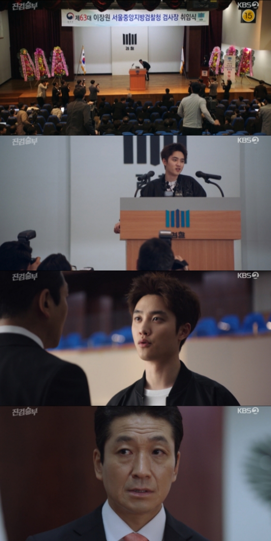 12일 오후 방송된 KBS 2TV 수목드라마 '진검승부'에서 송환대기실에 끌려갔던 진정(도경수 분)이 탈출 후 이장원(최광일 분)의 검사장 취임식에 나타났다.
