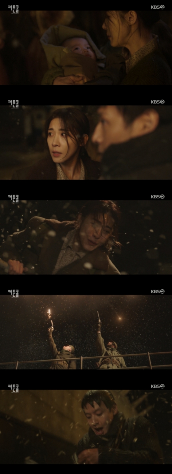 31일 오후 방송된 KBS 2TV 월화드라마 '커튼콜'에서 부부인 리종문(강하늘 분)과 자금순(하지원 분)이 어린 자식을 데리고 전쟁을 피하기 위해 사투를 벌였다.