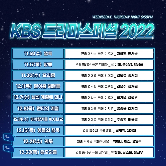 한편 '드라마 스페셜 2022'는 단막극 총 8편, TV 시네마 2편으로 꾸려졌다. 16일 오후 '얼룩', 17일 '방종', 30일 '프리즘', 12월 1일 '열아홉 해달들'이 방송된다.
