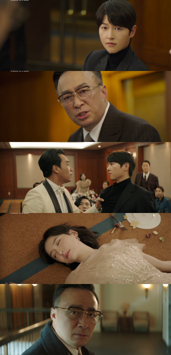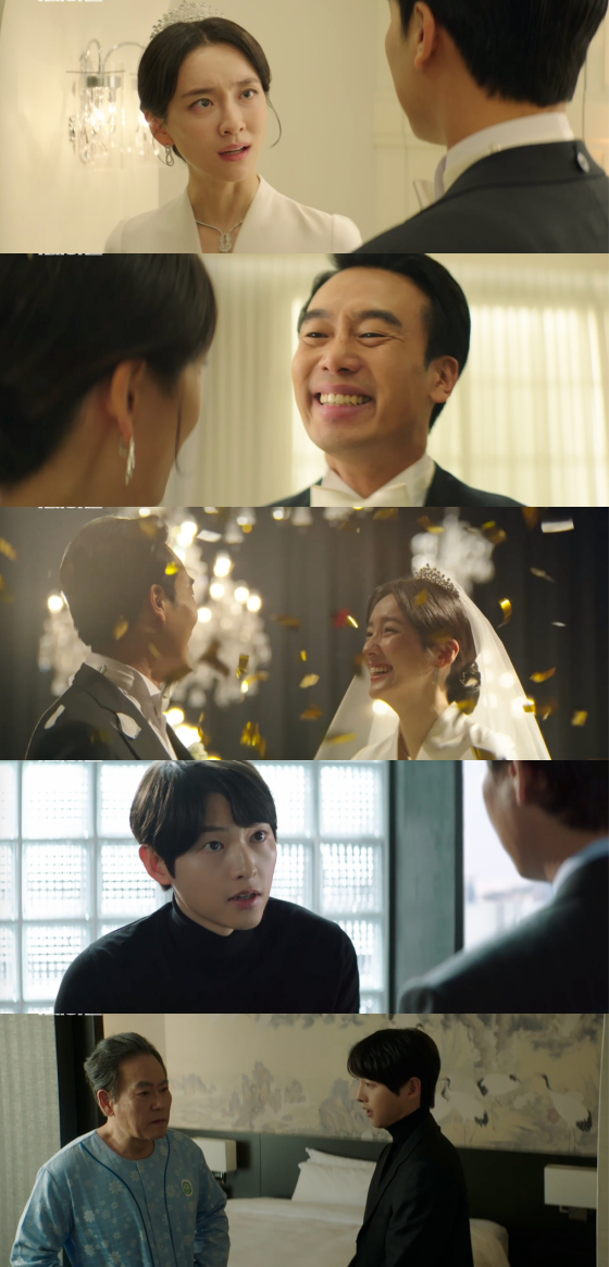 진성준은 이날 모현민의 신부 대기실에 단 둘이 남아 "예쁘다"며 극찬을 전했다. 진성준은 이어 "같이 왔으면 당신이 참 좋아했을텐데"라며 진도준(송중기 분)의 이름을 언급해 충격을 자아냈다. 모현민은 진성준이 진도준과 자신의 모든 비밀을 알고 있었다는 사실에 경악하며 머리에 쓴 왕관을 내던졌으나, 진성준은 "당신 이 결혼 절대 못 깬다"며 코웃음쳤다.