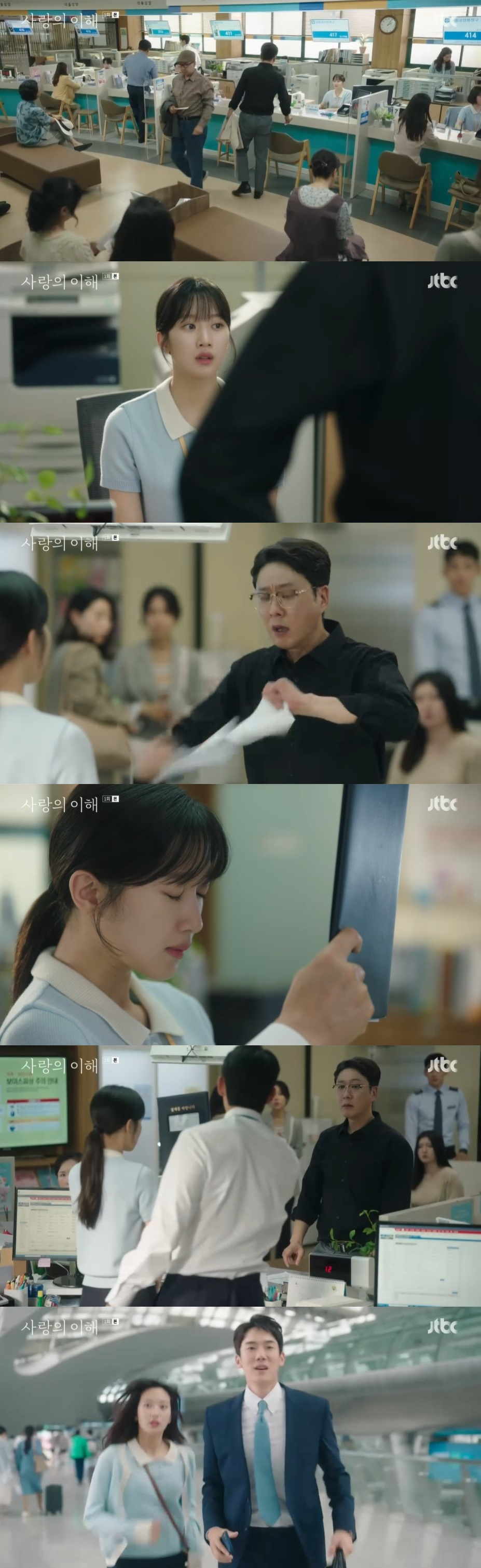 21일 첫 방송된 JTBC 드라마 '사랑의 이해'에서는 KCU은행 영포점 예금창구 4년 차 주임 안수영(문가영 분)이 진상 고객을 상대하는 모습이 담겼다.