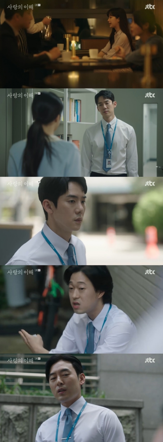 21일 첫 방송된 JTBC 드라마 '사랑의 이해'에서는 KCU은행 영포점 종합상담팀 3년 차 계장 하상수(유연석 분)가 예금창구 4년 차 주임 안수영(문가영 분)에게 데이트 신청하는 장면이 담겼다.
