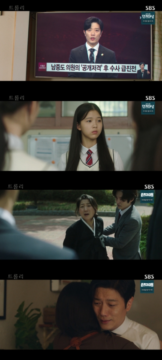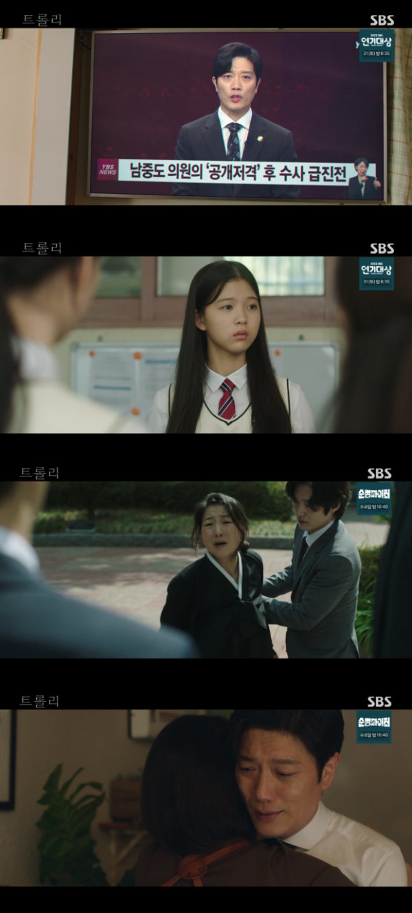 26일 오후 방송된 SBS 월화드라마 '트롤리'에서 남중도(박희순 분)가 디지털 성폭력 사건을 공론화해 가해자 의대생이 극단적 선택을 했다.