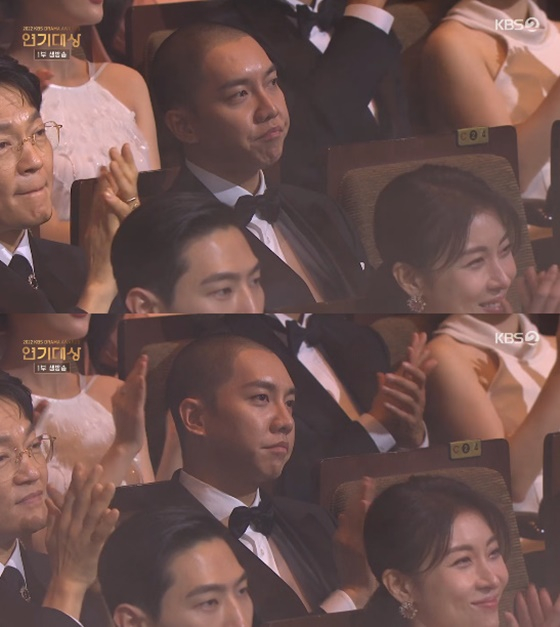 그의 무대가 끝난 후 배우들의 박수가 터져나왔다. 이때 이승기의 모습이 포착됐다. 이승기는 '법대로 사랑하라' 주연 자격으로 이번 시상식에 참석했다.