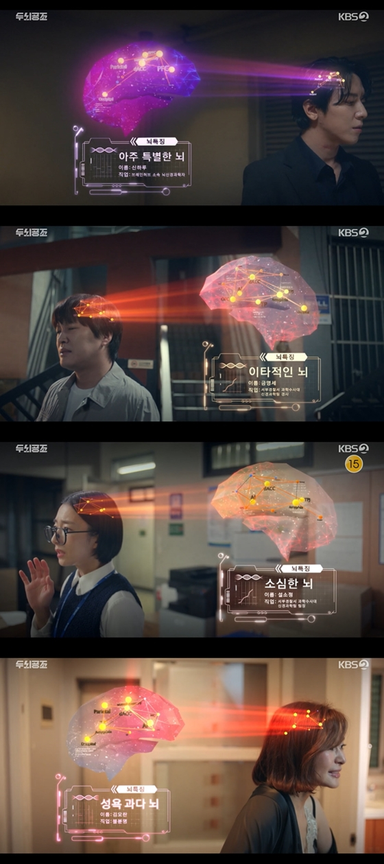 '두뇌공조' 1회에서는 주요 등장인물들의 소개와 함께 이들의 '뇌 특징'이 공개돼 눈길을 끌었다. 신하루는 '아주 특별한 뇌', 금명세는 '이타적인 뇌', 설소정은 '소심한 뇌'였다. 또한 금명세의 아내 김모란(예지원 분)은 '성욕 과다 뇌'라는 특징으로 어떤 일을 벌일지 호기심을 유발했다.