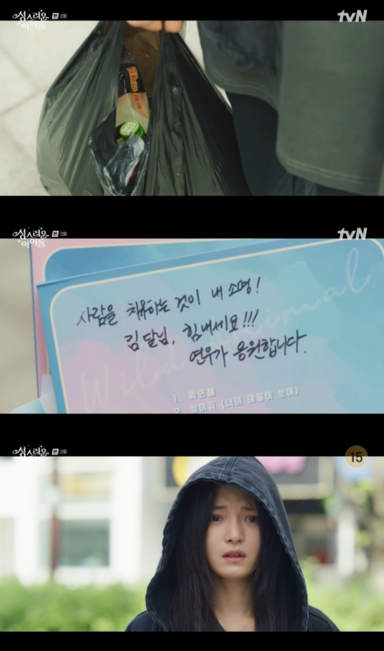 이때 CD를 나눠주던 우연우(김민규 분)는 김달에게 "안녕하세요. CD 받아 가세요. 이름이 어떻게 되세요?"라고 물었다. 김달은 "김달이요"라고 답했고, 사인을 하던 우연우는 봉투 속 번개탄과 소주를 발견했다.