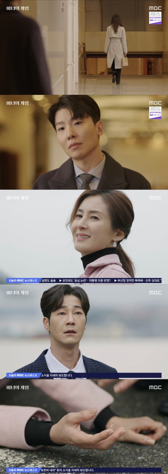 20일 오후 방송된 MBC 일일드라마 '마녀의 게임'에는 민선정(김선혜 분)이 정혜수(김규선 분), 유인하(이현석 분)의 약혼식장에서 기자회견을 준비하는 장면이 담겼다.