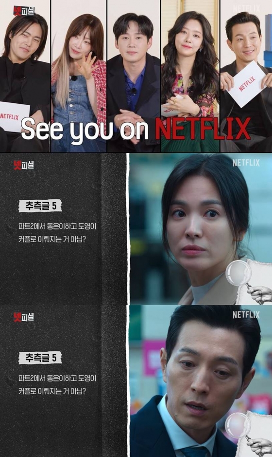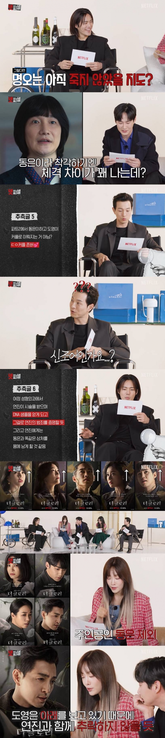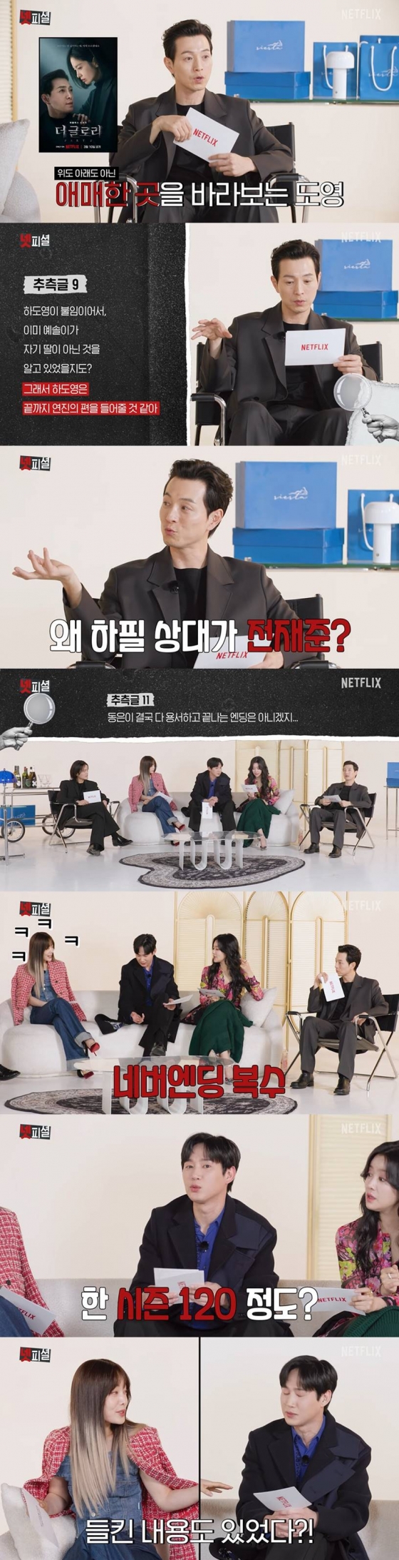 4일 유튜브 채널 Netflix K-Content 채널에는 '파트2 궁예글 중에 진짜가 있다?'라는 제목으로 영상이 올라왔다. 영상에는 손명오 역의 김건우, 이사라 역의 김히어라, 전재준 역 박성훈, 최혜정 역의 차주영 하도영 역의 정성일이 한 자리에 모여 오는 10일 공개를 앞둔 넷플릭스 드라마 '더 글로리' 파트2에 대한 추측에 답변하는 시간을 가졌다.