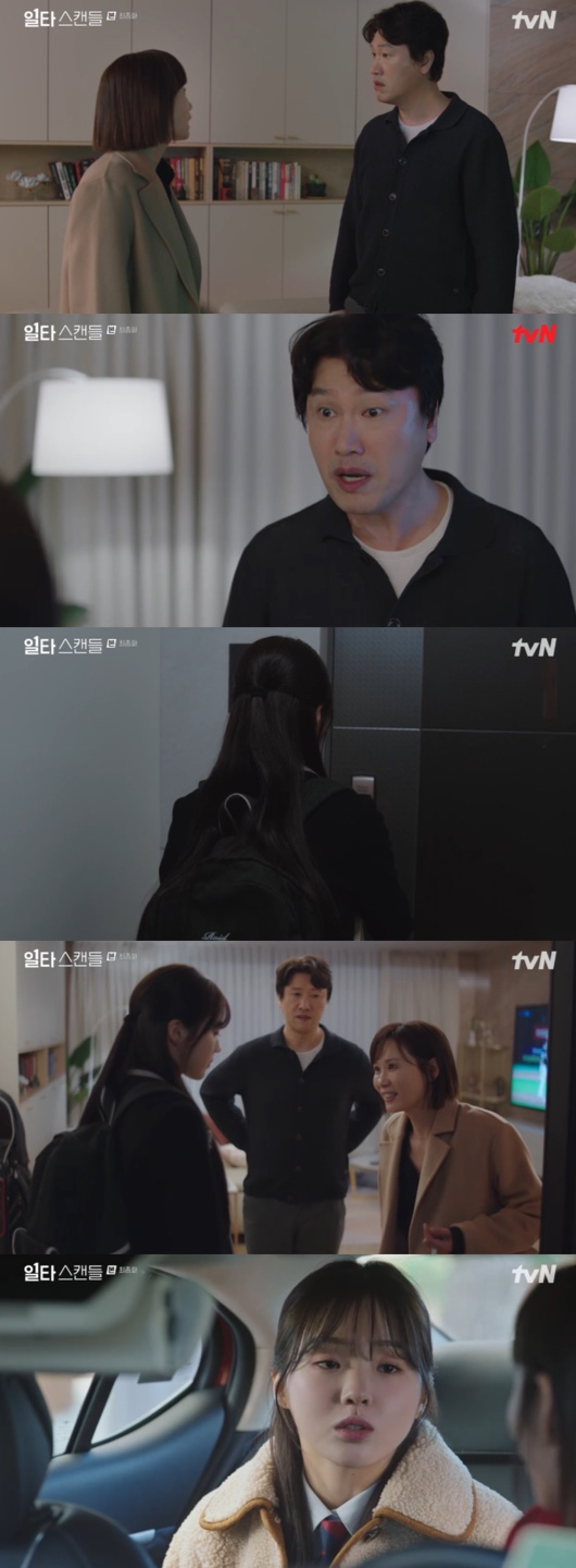 5일 방송된 tvN 토일드라마 '일타 스캔들' 마지막회에서는 엄마 조수희(김선영 분)가 부부싸움 하는 것을 집 밖에서 듣게 되는 방수아(강나언 분)의 모습이 그려졌다.