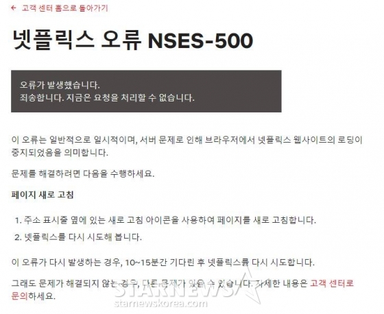 이는 '넷플릭스 오류 NSES-500'에 해당하는 것으로, 넷플릭스 측은 해당 오류에 대해 "일반적으로 일시적이며, 서버 문제로 인해 브라우저에서 넷플릭스 웹사이트의 로딩이 중지되었음을 의미한다"고 설명했다.