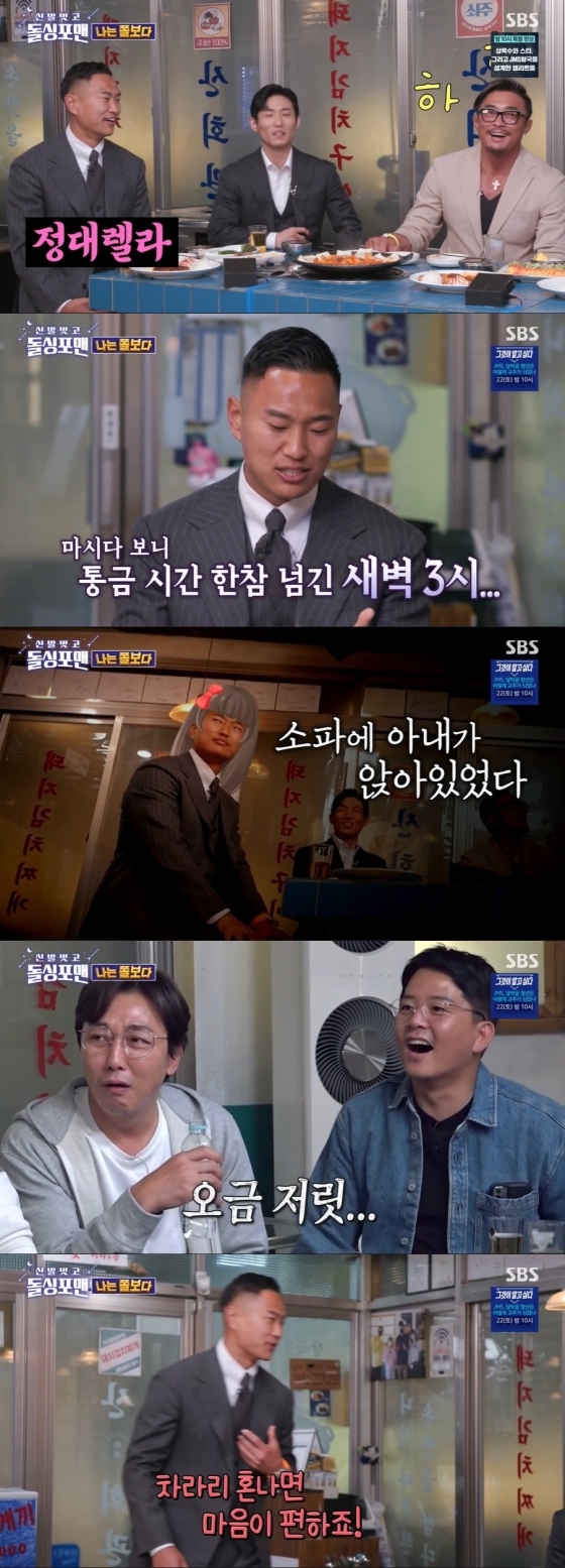 정대세는 "그런데 시즌 끝나고 선수들과 술을 마시러 갔다가 새벽 세 시가 됐다. 연락이 안 오니까 와이프가 주무시는 줄 알았다. 집에 돌아왔는데 불이 꺼져 있더라"라고 말해 멤버들이 긴장했다.