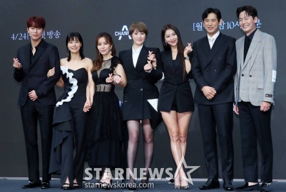 배우 신지훈, 유선, 신은정, 김선아, 오윤아, 오지호, 이정진이 24일 오후 서울 구로구 신도림동 더 세인트 웨딩에서 진행된 채널A 월화드라마 '가면의 여왕' 제작발표회에 참석해 포즈를 취하고 있다. '가면의 여왕'은 화려하게 성공한 세 여자 앞에 10년 전 그녀들의 거짓말로 살인자가 된 절친이 나타나면서 가면에 감춰져 있던 진실이 드러나고, 한 남자로 인해 인생의 소용돌이를 맞게 된 친구들의 욕망이 충돌하는 미스터리 멜로 복수극이다. 2023.04.24 /사진=김창현 기자 chmt@