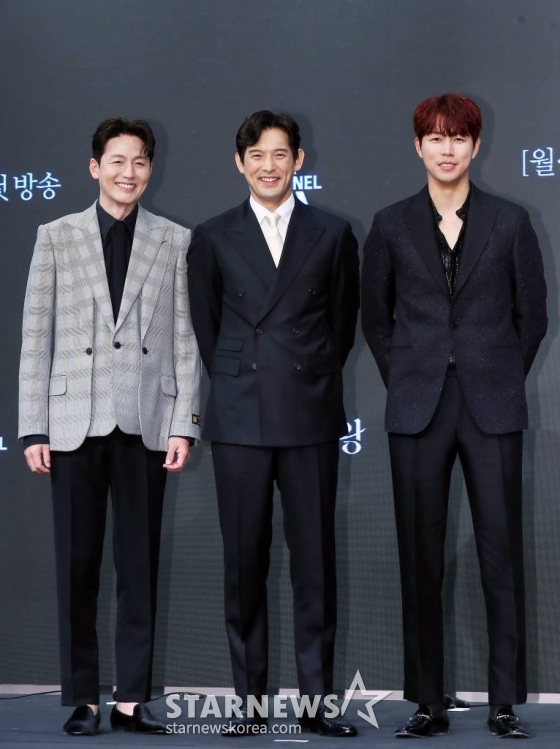 배우 이정진, 오지호, 신지훈이 24일 오후 서울 구로구 신도림동 더 세인트 웨딩에서 진행된 채널A 월화드라마 '가면의 여왕' 제작발표회에 참석해 포즈를 취하고 있다. '가면의 여왕'은 화려하게 성공한 세 여자 앞에 10년 전 그녀들의 거짓말로 살인자가 된 절친이 나타나면서 가면에 감춰져 있던 진실이 드러나고, 한 남자로 인해 인생의 소용돌이를 맞게 된 친구들의 욕망이 충돌하는 미스터리 멜로 복수극이다. 2023.04.24 /사진=김창현 기자 chmt@