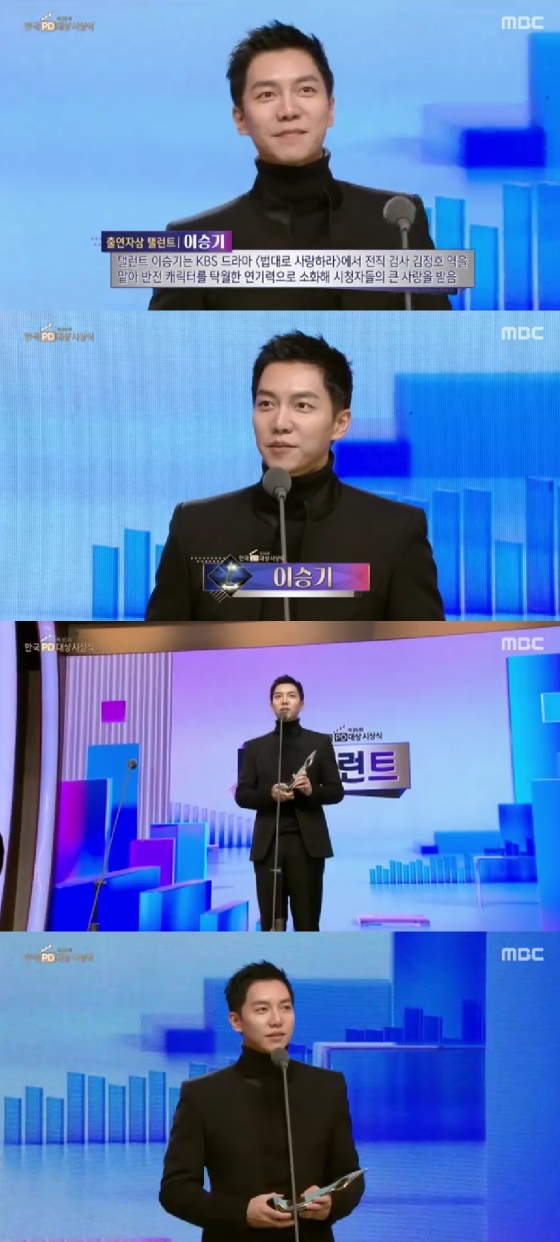MBC는 26일 제35회 '한국PD대상' 시상식을 녹화중계했고, 이승기는 KBS 2TV 드라마 '법대로 사랑하라'를 통해 '한국PD대상'에서 탤런트상을 받았다.