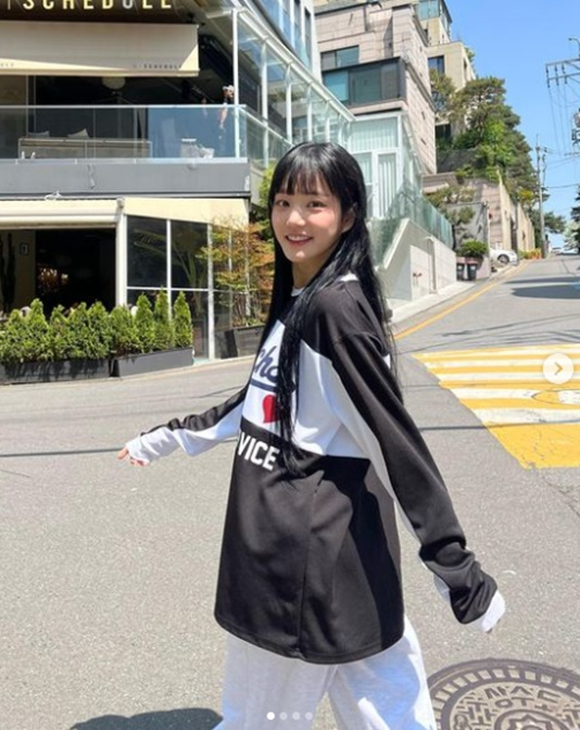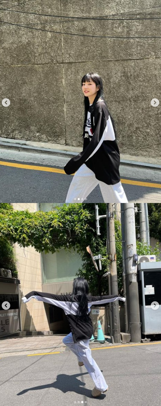 이유비는 트레이닝 바지에 박시한 티셔츠를 매치, 편안한 모습으로 길을 걷고 있다. 뱅헤어스타일에 긴 머리카락을 늘어뜨린 이유비는 아직 학생 같은 동안 미모를 자랑한다. 신난 듯 뛰어다니는 듯한 모습이 귀여워 보인다.
