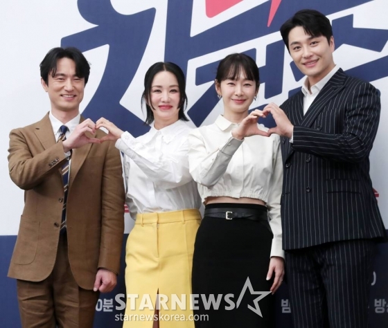 배우 김병철, 엄정화, 명세빈, 민우혁이 13일 오후 서울 강남구 조설팰리스에서 진행된 JTBC 토일드라마 '닥터 차정숙' 제작발표회에 참석해 포즈를 취하고 있다. '닥터 차정숙'은 20년차 가정주부에서 1년차 레지던트가 된 차정숙의 찢어진 인생 봉합기를 그린다. 가족이 전부였던 평범한 주부에서 '왕년'에 잘나가던 닥터 차정숙으로 각성한 '정숙'치 못한 스캔들이 유쾌한 웃음과 현실적인 공감을 선사할 예정이다. 오는 15일 첫 방송. 2023.04.13 /사진=김창현 기자 chmt@