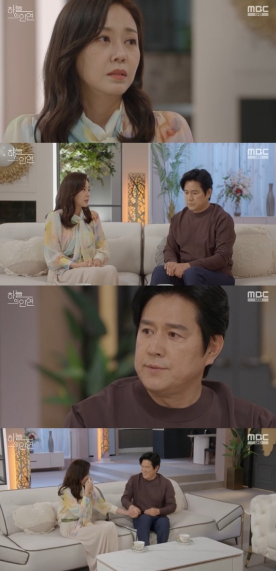 18일 오후 방송된 MBC 일일드라마 '하늘의 인연' 24회에서 채영은(조미령 분)과 하윤모(변우민 분)가 진지한 대화를 하는 모습이 담겼다.
