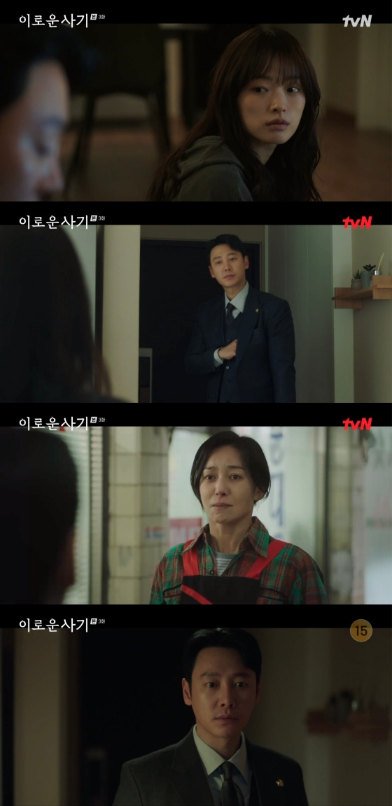 5일 방송된 tvN 월화드라마 '이로운 사기'에서는 한무영(김동욱 분)이 스스로 목숨을 끊으려는 서계숙(장영남 분)을 말리는 장면이 담겼다.