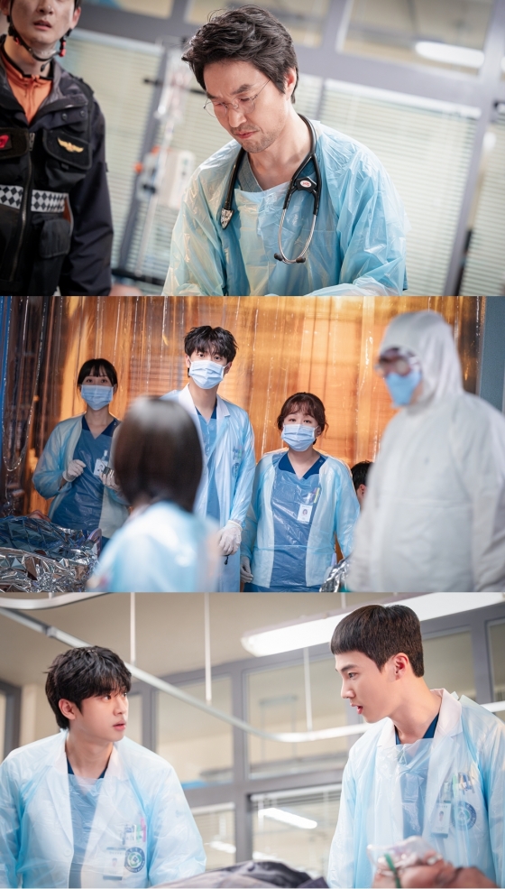 이날 공개된 사진 속 김사부(한석규 분)와 돌담즈는 응급실을 가득 채운 부상자들을 살피고 있다. 화재로 인해 열상을 입고, 호흡 곤란을 일으키는 등 고통을 호소하는 환자들이 끊이지 않아 긴박함을 자아낸다.