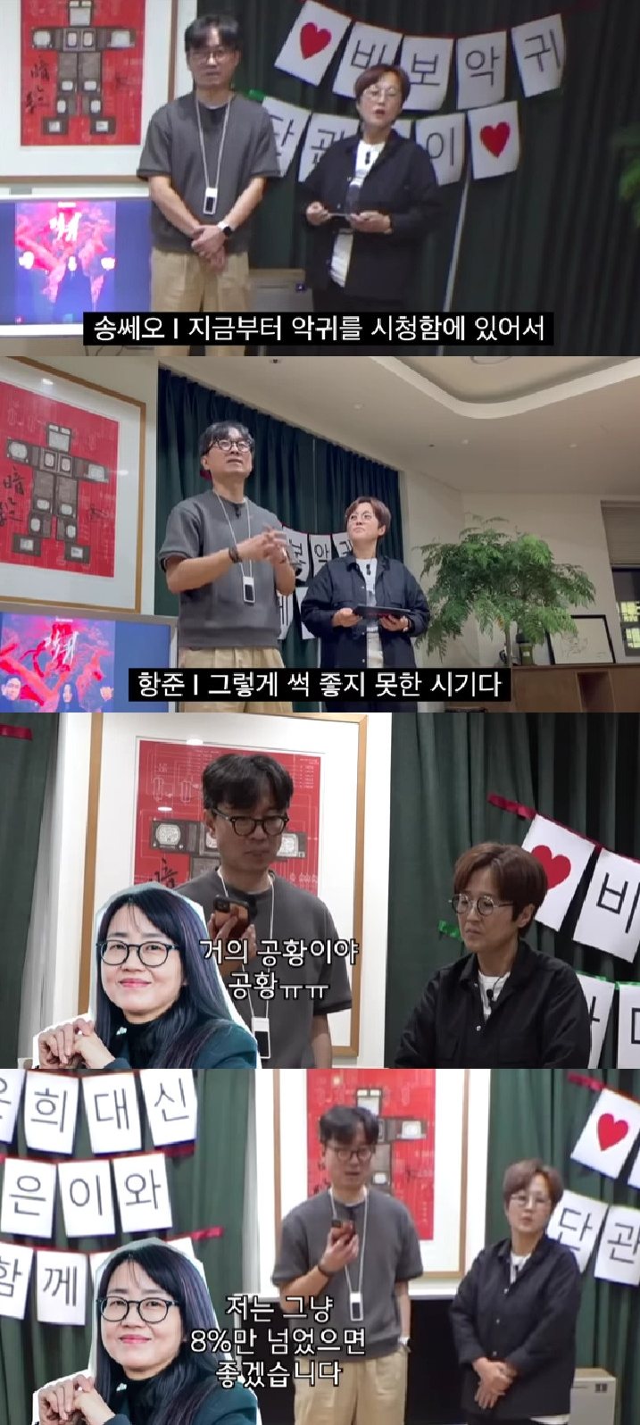 장항준 감독은 첫 방송 시청 후 아내인 김은희 작가와 전화 연결을 시도했다. 김은희 작가는 "거의 공황이야 공황"이라며 "저는 그냥 시청률 8%만 넘었으면 좋겠다. 정말 모르겠다. 마지막 방송은 같이 봤으면 좋겠다"고 말했다.