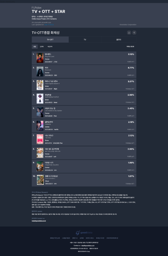 18일 K-콘텐츠 경쟁력 분석 전문 기관 굿데이터코퍼레이션 공식 플랫폼 서비스 펀덱스가 발표한 2023년 7월 2주차 K-콘텐츠 화제성 조사 결과, JTBC 토일드라마 '킹더랜드'가 TV+OTT 드라마 종합 화제성에서 1위에 올랐다.