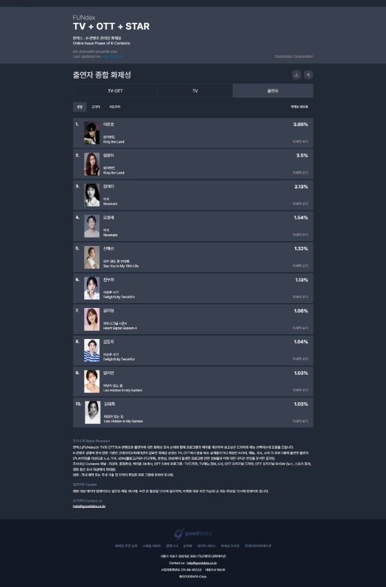 출연자 종합(드라마, 비드라마) 화제성에서는 '킹더랜드' 주인공 이준호, 임윤아가 나란히 1위와 2위를 차지했다. 이준호와 임윤아는 드라마 출연자 화제성에서도 1위와 2위를 각각 차지했다.
