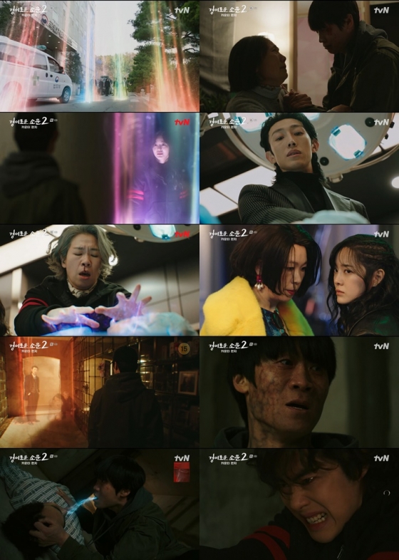 13일 방송된 tvN '경이로운 소문2: 카운터 펀치'(극본 김새봄·연출 유선동, 이하 '경이로운 소문2') 6회는 카운터 소문(조병규 분)이 3단계를 뛰어넘는 악귀로 거듭난 마주석(진선규 분)과 처음 맞대결하는 심장 쫄깃한 엔딩이 그려지며 긴장감을 폭주시켰다. 구치소에서 탈옥한 악귀 진선규는 자신을 막아서는 소문에게 "예전으로 돌아갈 수 없어. 이거는 내 복수니까 날 방해하지 마"라며 능숙한 염력으로 그를 막은 후 자취를 감췄다. 이를 지켜보던 필광과 겔리는 상상 이상의 악귀로 재 탄생한 마주석을 보고 "이제부터 시작이지. 진짜 시작"이라고 감탄하며 소문을 무너뜨릴 한 방으로 기대감을 높였다.