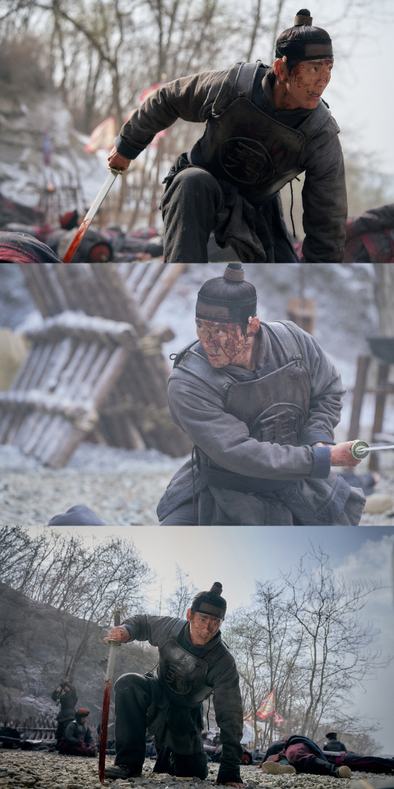 공개된 사진 속 이장현은 얼굴 가득 붉은 피를 묻힌 채 수많은 오랑캐들과 맞서 싸우고 있다. 한 마리 짐승처럼 날카롭게 번뜩이는 이장현의 눈빛과 표정에서 강렬한 카리스마가 느껴진다. 이장현의 칼에는 붉은 피가 얼룩져 있고, 그의 곁에는 수많은 오랑캐들이 바닥에 쓰러져 있다. 또 이장현이 오랑캐인 청병의 갑옷을 입고 있어 눈길을 끈다.