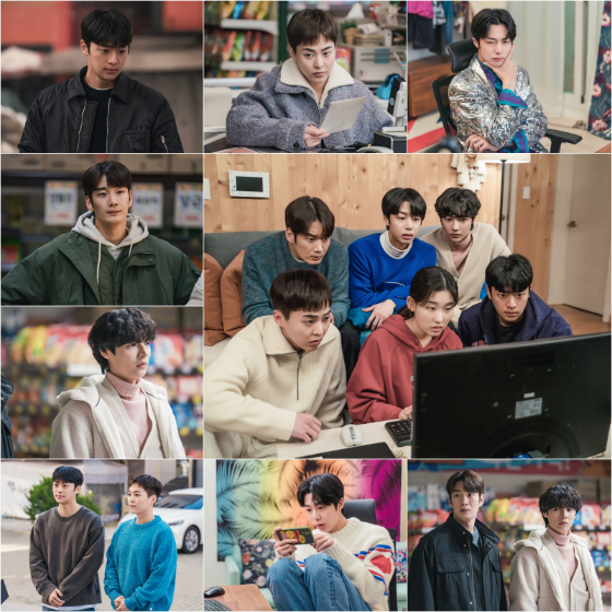 제작진은 허름한 마트도 반짝반짝 빛을 내는 '사장돌' 5인방의 스틸컷을 대거 공개했다. 정상의 무대에 섰던 아이돌 그룹 '썬더보이즈'의 리더 '최호랑'(이신영 분), 메인 댄서 '신태호'(시우민 분), 래퍼 '조이준'(채형원), 보컬 '은영민'(최원명 분), 그리고 막내 '윤상우'(이세온 분)가 그 주인공이다. 비록 현재는 화려한 조명을 뒤로 한 채, 언제 망할지 모르는 마트를 인수하게 됐지만, 빛이 나는 아우라엔 변함이 없다.