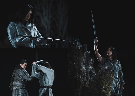공개된 사진 속에는 철검을 하늘 높이 치켜들며 결연한 표정을 짓고 있는 은섬의 모습이 담겼다. 또한 누군가로부터 철검을 건네받는가 하면 탄야의 호위관 양차(기도훈 분)와도 충돌 중이다.