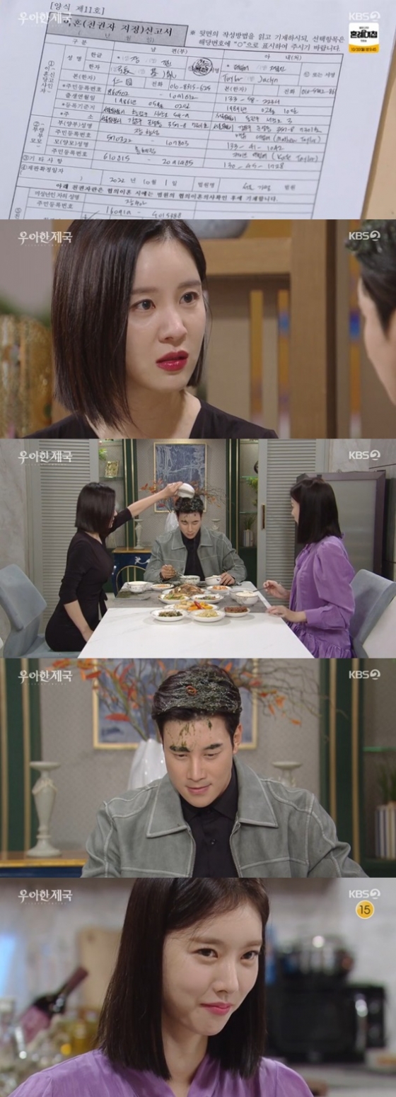 18일 방송된 KBS 2TV 일일드라마 '우아한 제국' 40회에서는 재클린 테일러(손성윤 분)가 장기윤(이시강 분)의 머리에 매생이국을 엎는 모습이 담겼다.