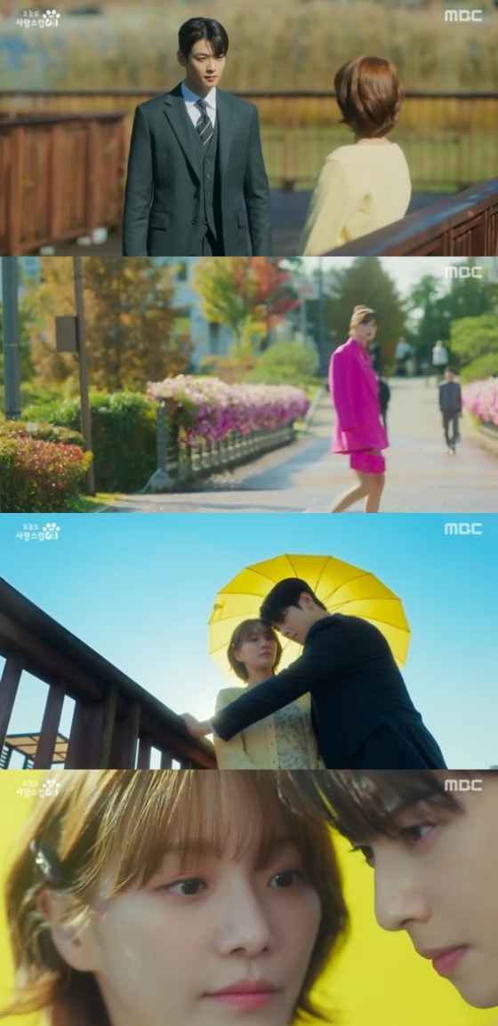 '오늘도 사랑스럽개'에서 차은우가 이서엘의 눈을 피하기 위해 우산 속에서 박규영과 초밀착 상황을 만들었다.