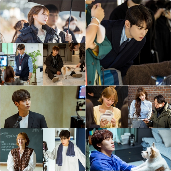 5회 방송을 앞두고 8일(오늘) '오늘도 사랑스럽개' 측은 배우 차은우(진서원 역), 박규영(한해나 역), 이현우(이보겸 역), 윤현수(최율 역), 이서엘(윤채아 역), 연기견(犬) 핀아(개나 역) 등 작품에 대한 열정과 애정으로 뭉친 배우들의 훈훈한 촬영 현장 스틸을 공개했다. 각자의 방식으로 촬영 현장을 불태우고 있는 배우들의 모습이 눈을 뗄 수 없게 만들었다.