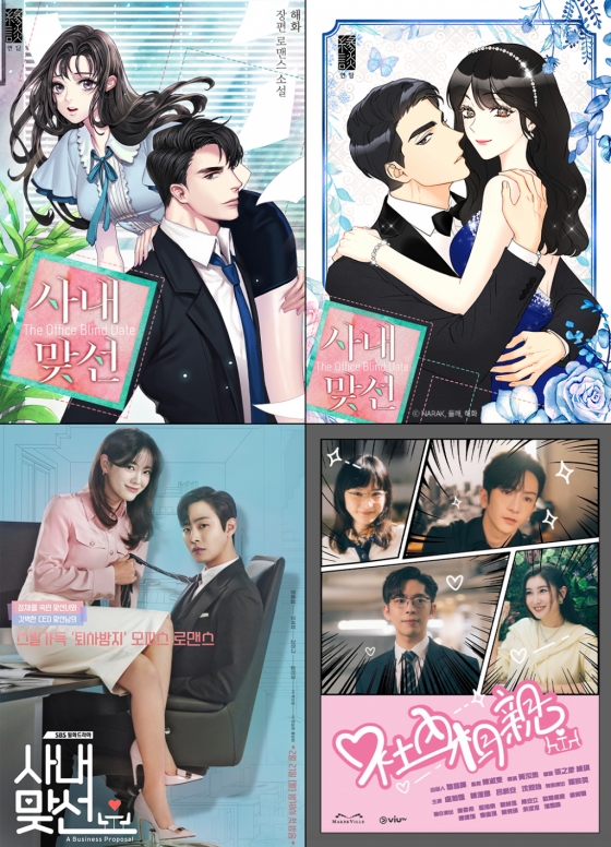 /사진제공=좌측 상단부터 시계 방향으로 <사내 맞선> 웹소설, 웹툰, 홍콩 드라마, 한국 드라마 표지