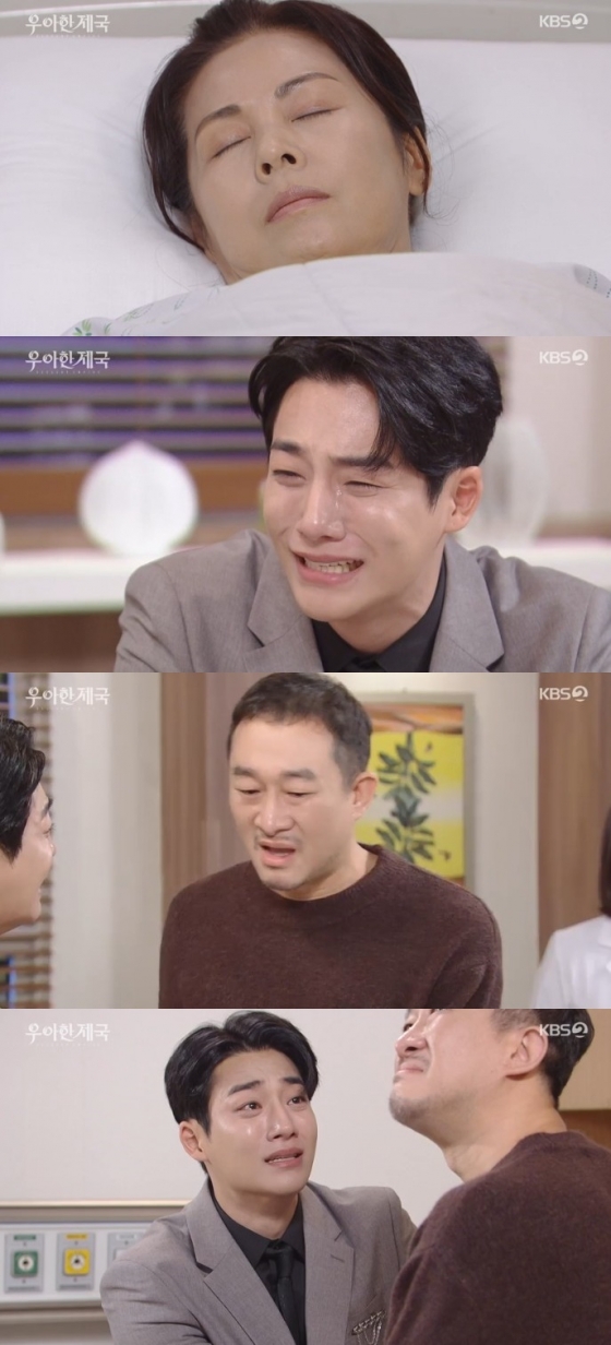 14일 방송된 KBS 2TV 일일드라마 '우아한 제국' 57회에서는 정우혁(강율 분)이 어머니 정준희(김미라 분)를 붙잡고 울부짖는 모습이 담겼다.