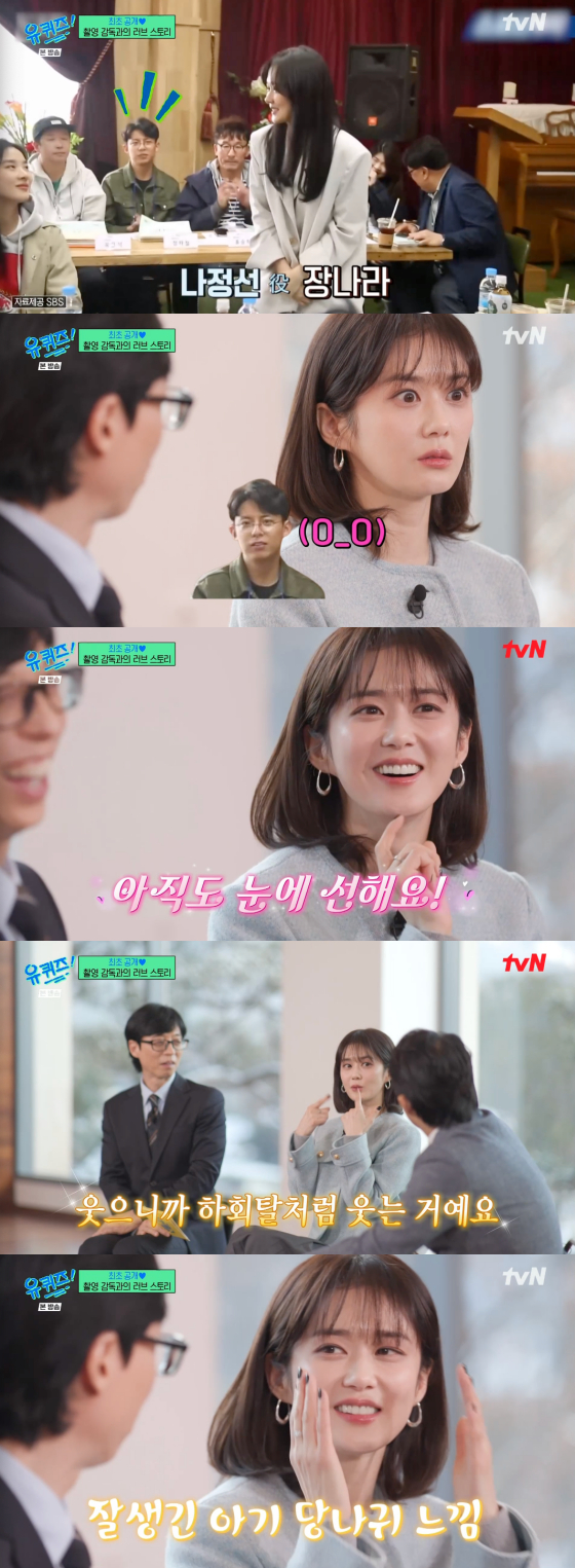 MC 유재석은 이에 "생각만 해도 너무 좋냐", "촬영장에 악의 있는 얼굴이 있겠냐"며 놀렸지만 장나라는 "제 기준에는 너무 괜찮았다. 실물이 조금 더 잘생겼다. 잘생긴 아기 당나귀 느낌"이라며 자랑을 늘어놔 웃음을 자아냈다.
