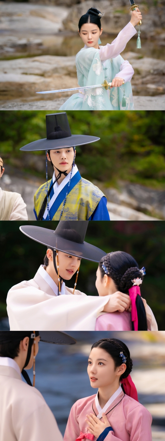 그런 가운데 공개된 사진은 월심과 이선의 범상치 않은 만남이 담겨있다. 먼저, 검무를 추는 월심의 아름다운 춤 선이 눈길을 사로잡는다. 단아한 얼굴엔 어딘가 처연함이 스친다. 월심의 검무에 홀린 듯 눈길을 빼앗긴 이선의 모습도 흥미롭다. 이어 월심에게 '십자가 목걸이'를 건네는 이선의 눈빛은 사랑에 푹 빠진 모습이다. 서로를 가득 담은 달콤한 눈맞춤은 이들 관계를 짐작게 한다.