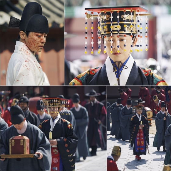 배우 조정석이 피칠갑 된 섬뜩한 모습과 함께 장엄하고 위엄 넘치는 임금 즉위식을 공개했다.